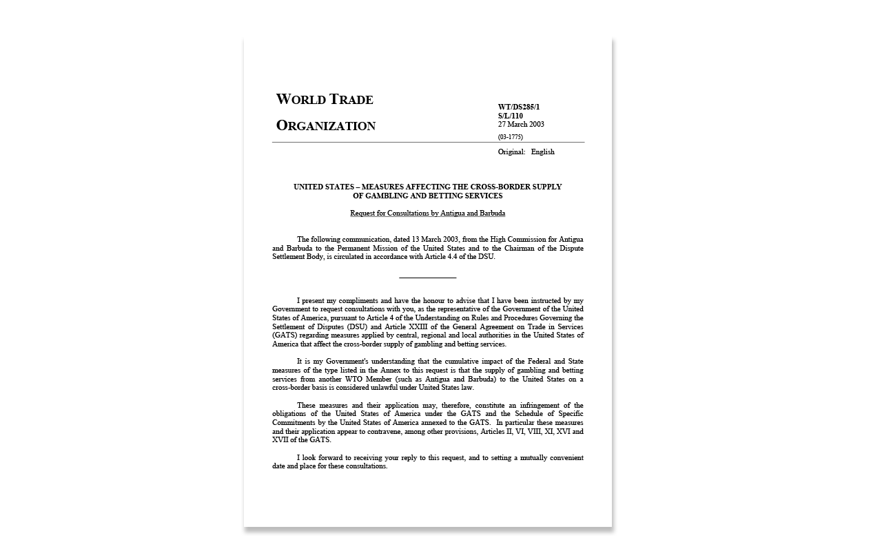 World Sports Exchange worked with Antigua to file an official complaint against the United States claiming it discriminated against online gambling companies, which were legal and licensed in its country. Antigua won the case but the United States has refused to comply with the decision to this day.
